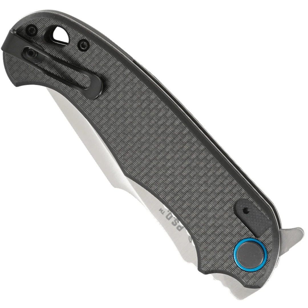 The recurve of the blade performs when making deep cuts and slicing and the double grind makes for maximum efficiency. The compact G10 and Carbon Fiber handle provides a solid four finger grip. The electric blue pivot and pocket clip make for a visual pop.