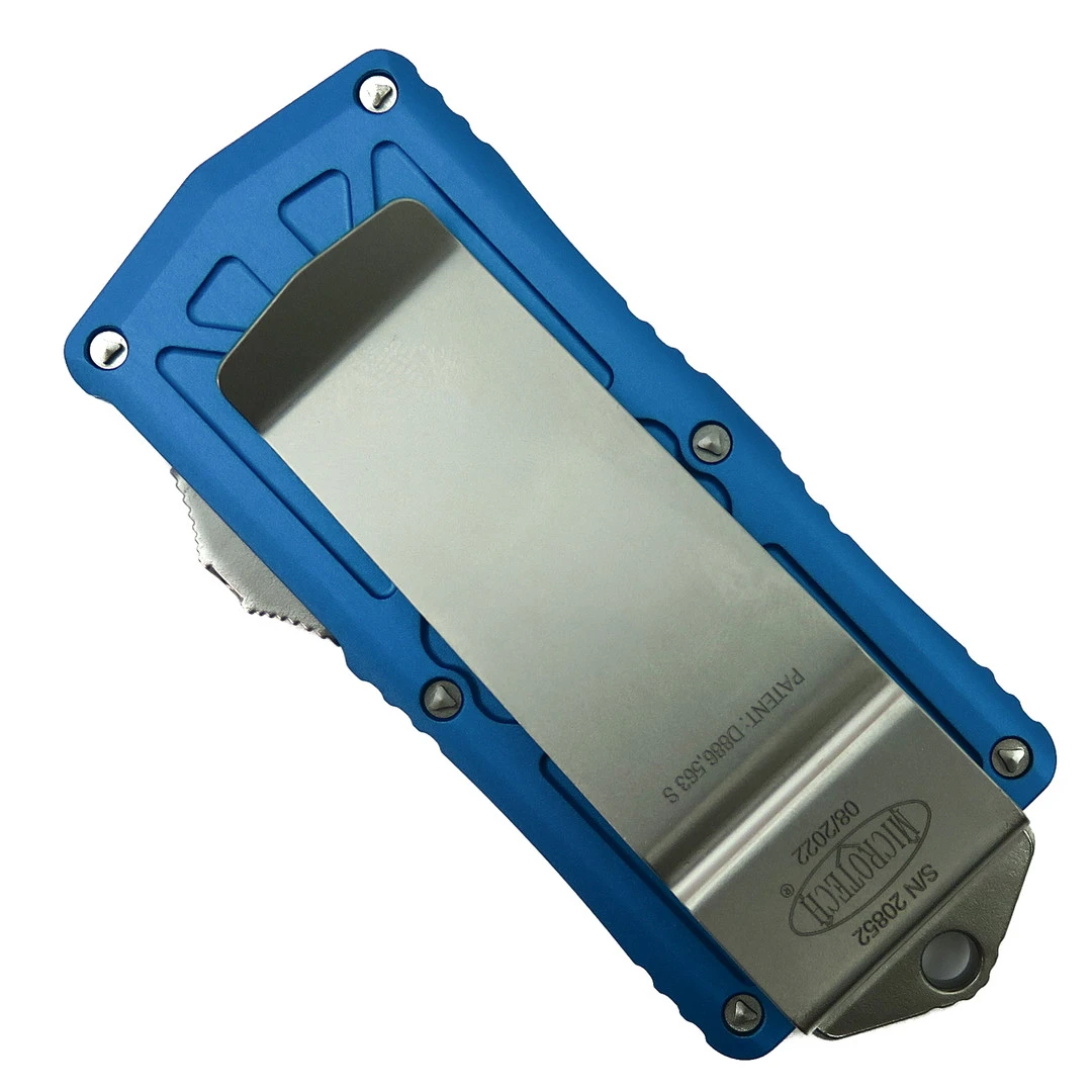 This Microtech Exocet out-the-front knife features a Blue anodized handle and a stonewash finished M390 dual-edge blade with one fully serrated edge and one standard edge.