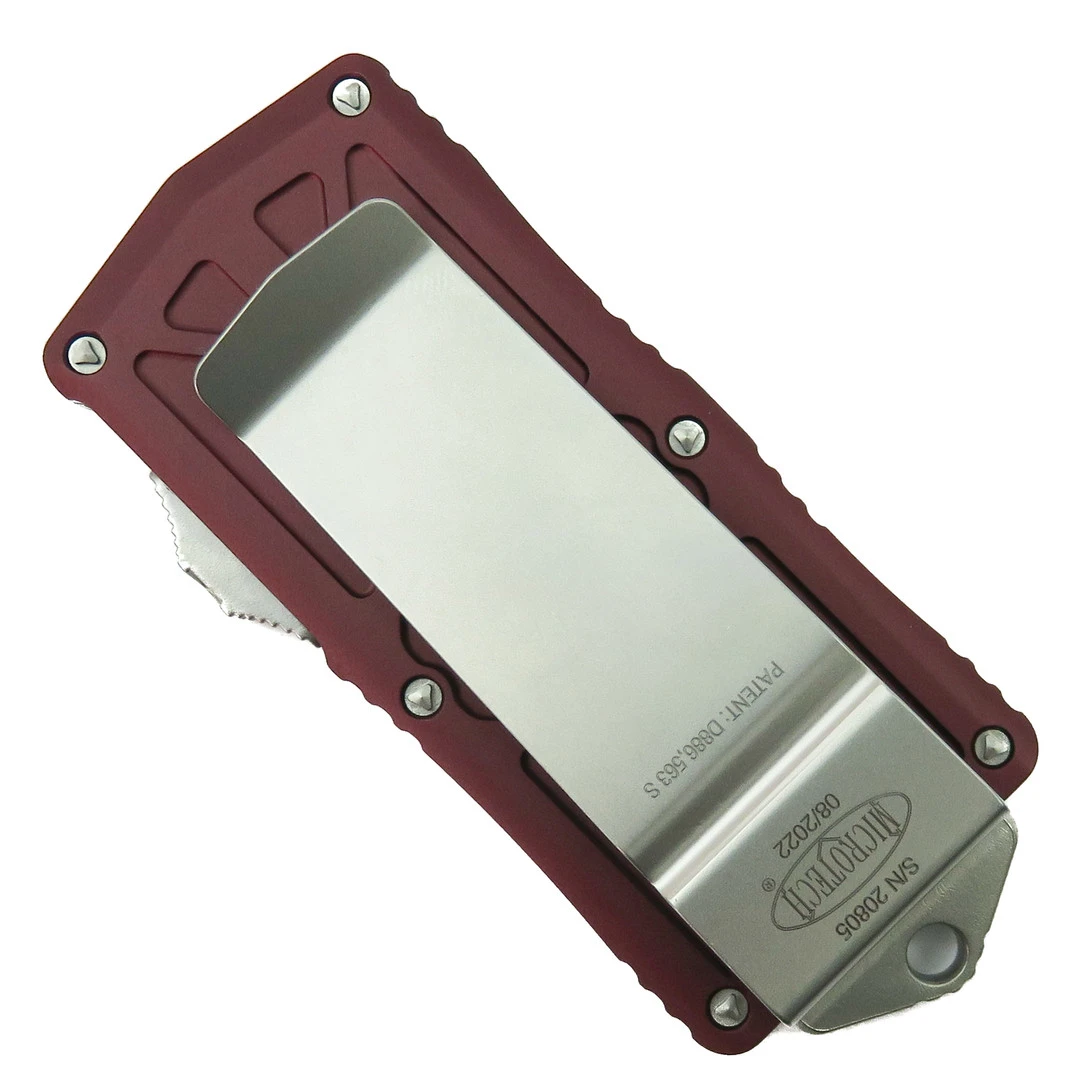 This Microtech Exocet out-the-front knife features a Merlot anodized handle and a stonewash finished M390 dual-edge blade with one fully serrated edge and one standard edge.