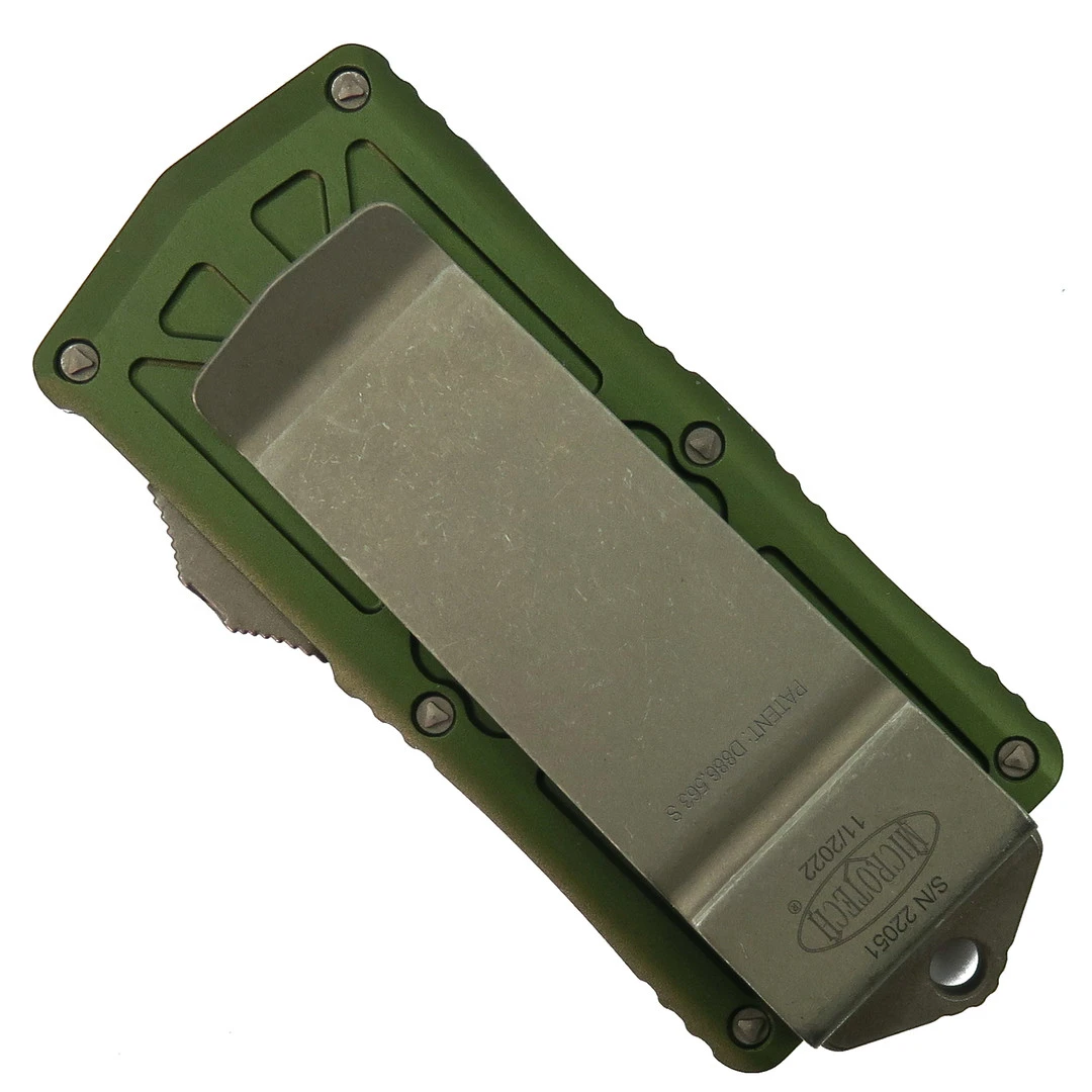 This Microtech Exocet out-the-front knife features an OD Green anodized handle and a dagger style blade with a bronze apocalyptic stonewash finish.