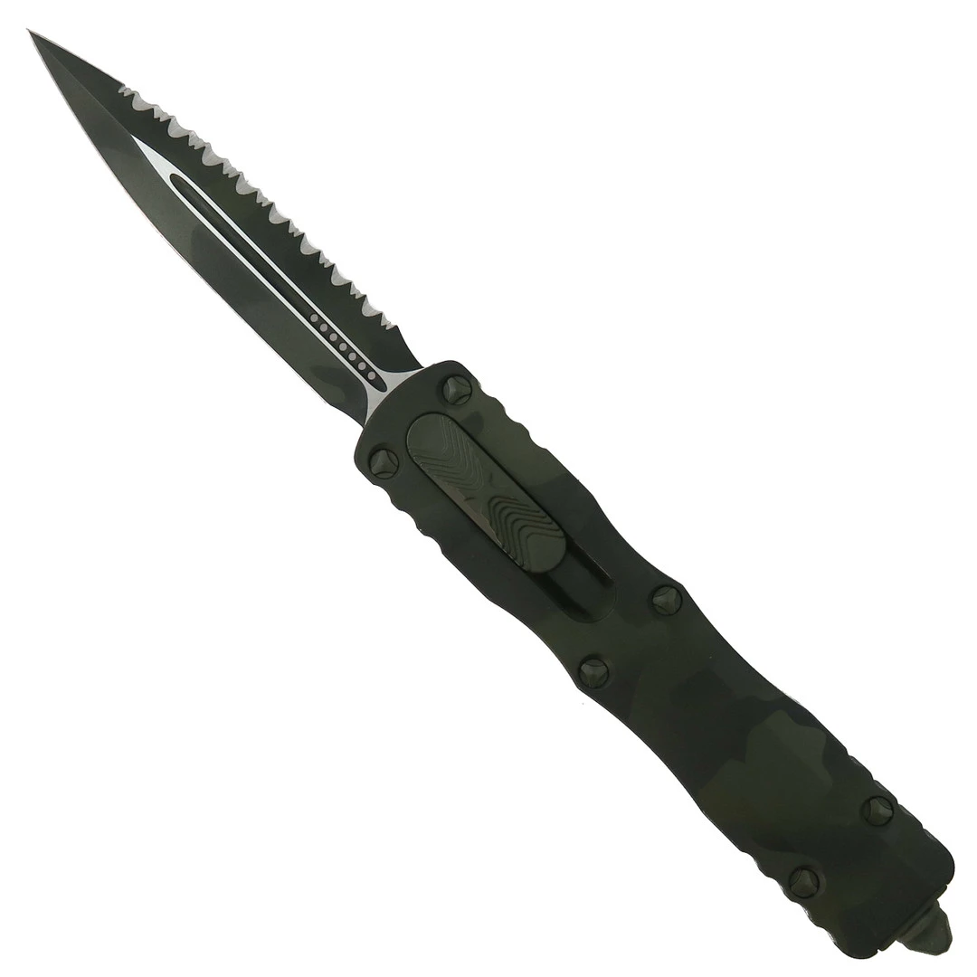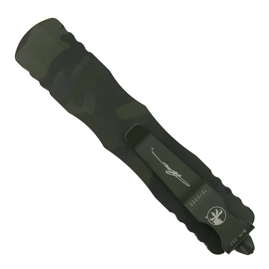 This Microtech Dirac Signature Series Out the Front auto knife features an Olive green camo Mil-Spec hard anodized handle.