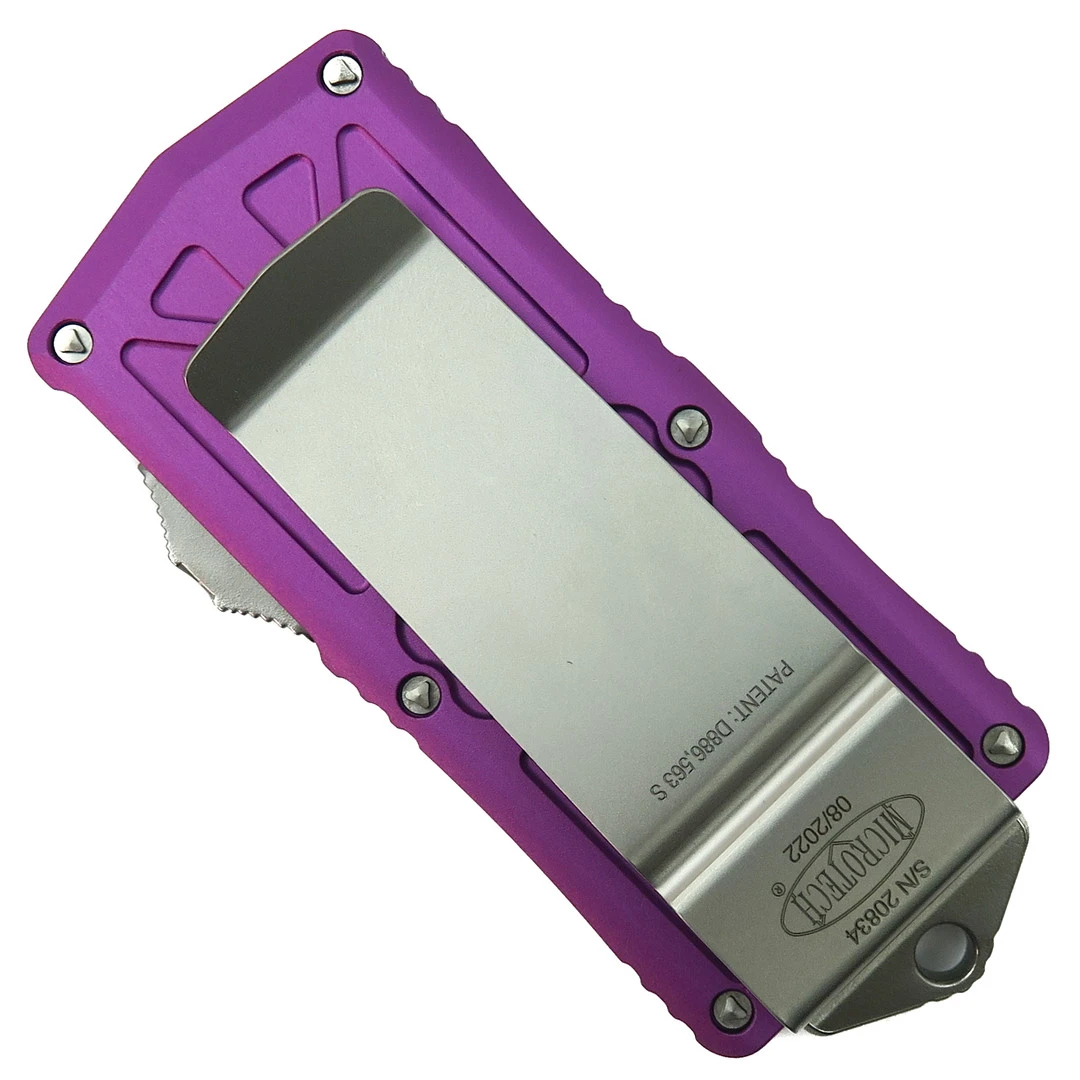 This Microtech Exocet out-the-front knife features a violet anodized handle and a stonewash finished M390 dual-edge blade with one fully serrated edge and one standard edge.
