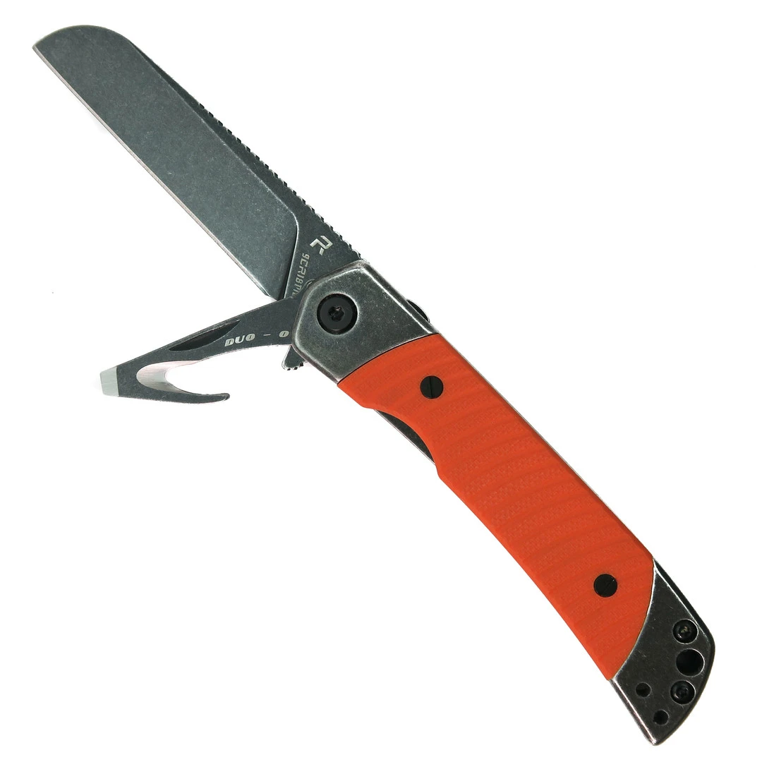 The REVO Duo Orange Sheepsfoot Frame Lock Knife is a handy, lightweight knife. The rescue hook/seatbelt cutter with a slotted drive gives this knife double the abilities while retaining the traditional knife form. The sheepsfoot style blade of this knife is made of 9Cr18MoV stainless steel with a black stonewash finish. This steel provides durability and excellent corrosion resistance. The milled G10 handle scales are comfortable, providing a solid grip. This knife boasts a sleek black backspacer. The main blade opens smoothly with a flipper tab, while the rescue hook tool opens by nail nick. This capable knife is a fantastic everyday carry.Â