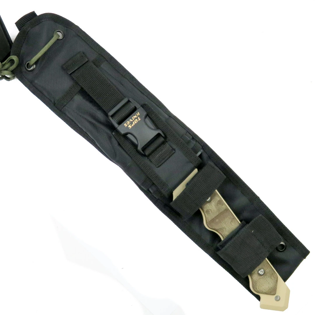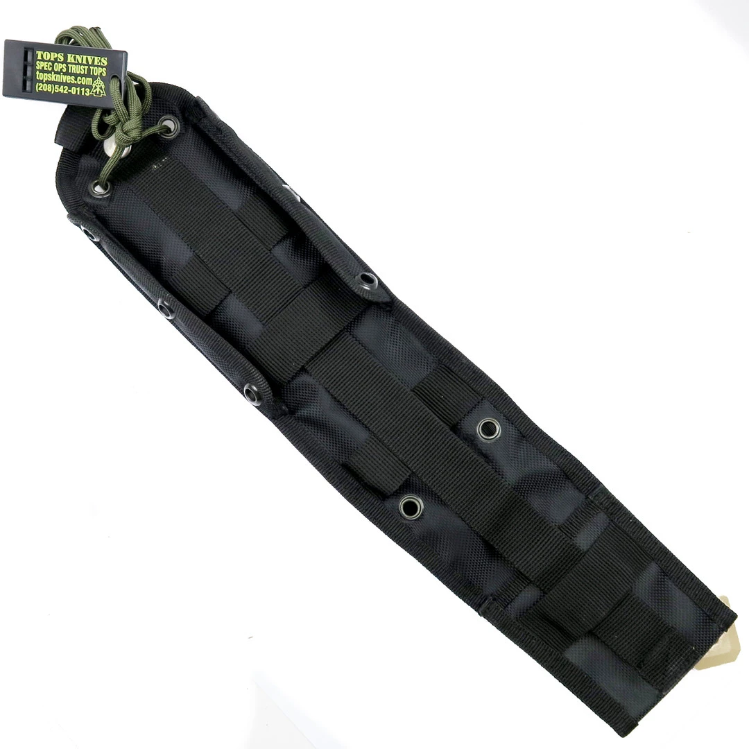 The unique and rugged design of the TOPS CUMA TAK-TI is highlighted by the ability to utilize the “long grip” for full extended machete swings or a “choked-up grip” for precision cuts or carving. The name was a hybrid of Tactical and Kukri and historically is a Nepalese knife which was used as both a tool and a weapon. Fun fact–the CUMA TAK-RI can be seen in the G.I. Joe comic books series “Snake Eyes” and is also the series’ exclusive. This model features green canvas micarta handles in a Rocky Mountain Tread pattern, a kukri style blade in a coyote tan coating and the black ballistic nylon sheath includes MOLLE backing and provides a belt carry option. Made in the USA.