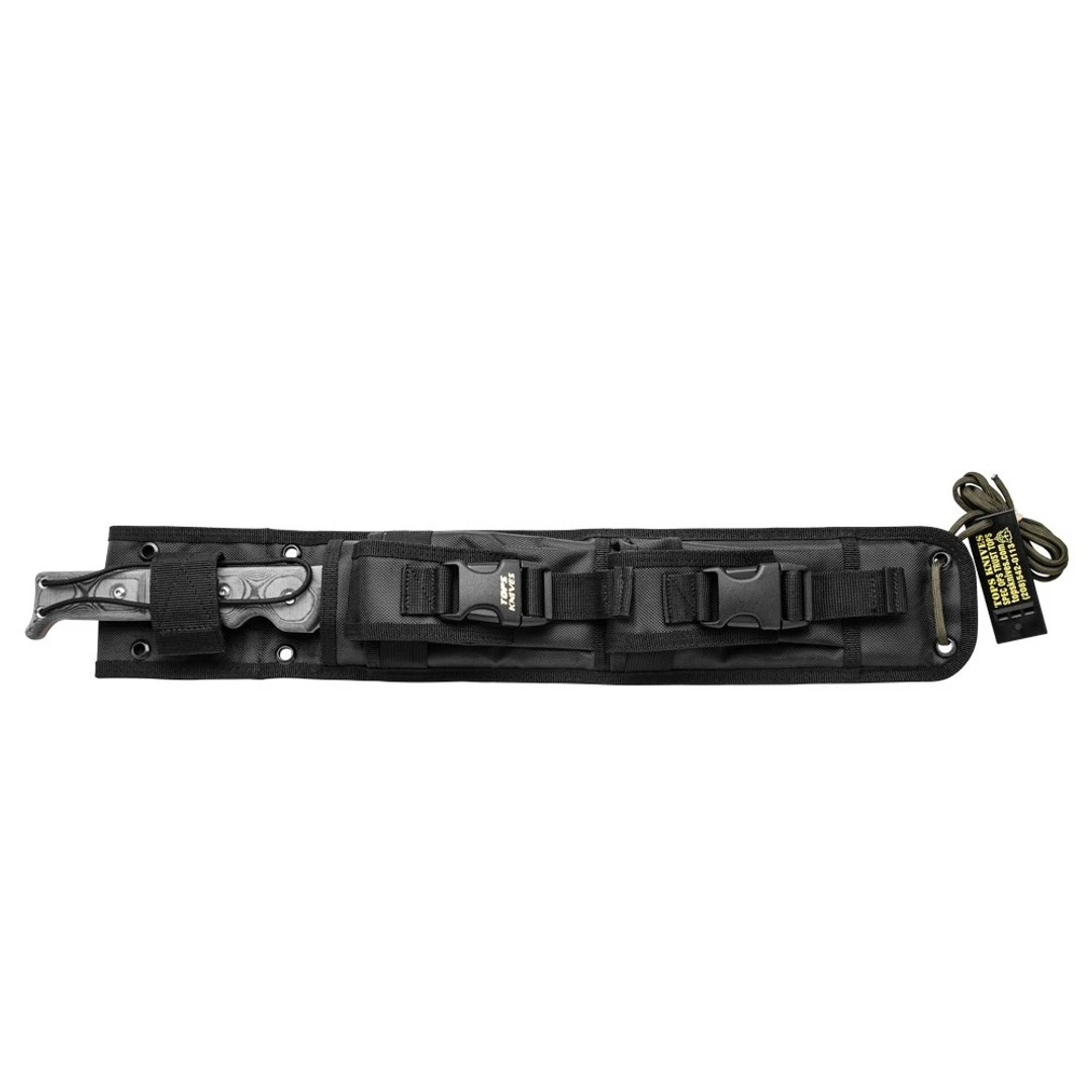 This fixed blade knife features black linen micarta handles, a machete style blade in a tactical grey finish and includes a nylon sheath.